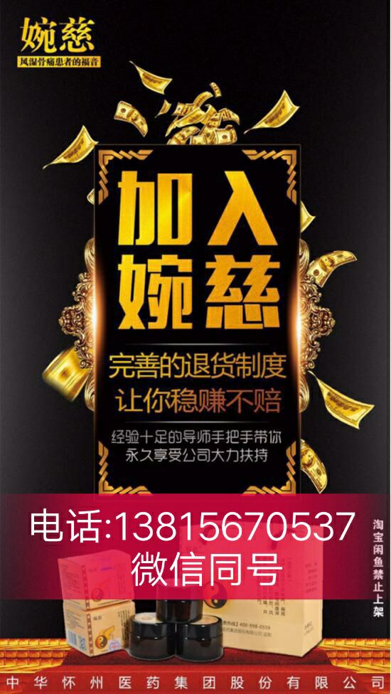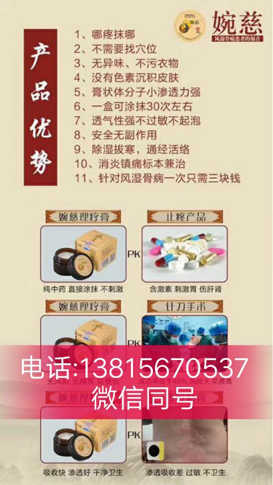 婉慈理疗膏,首款唯一涂抹式膏药,使用方便,哪里痛抹哪里,摆脱传统药贴的局限性,无任何副作用,气味清新不刺鼻。秉承中医精髓,可以排寒除湿,活血化瘀,通经活络,消肿止痛,解决了数万人的风湿骨病痛苦。公司大力扶持线下实体店,详情咨询13815670537微信同号