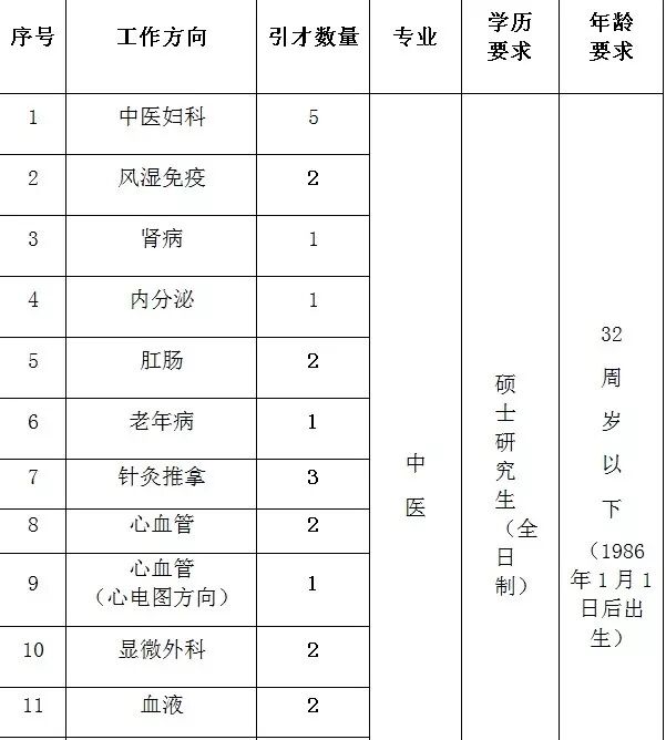 (1)紧缺专业的副高级及以上职称人员(仅限医疗和医技专业):要求有3年以上三级医院工作经历,副高职称年龄45岁以下(1973年9月1日后出生),正高职称年龄50岁以下(1968年9月1日后出生)。紧缺专业:小儿外科、妇产科、儿科、急诊、重症医学、麻醉科、心脏外科、眼科、介入科等。副高和正高职称人员要求第一学历为统招全日制大专及以上学历。