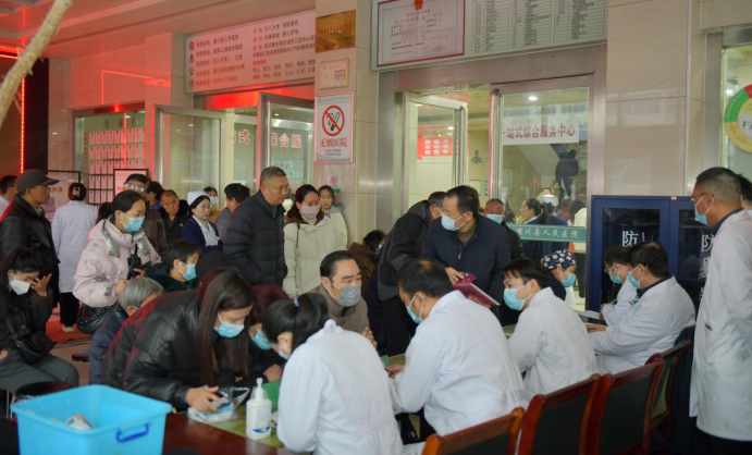 见面会后,湖北省人民医院(武汉大学人民医院)光谷院区胸外科主任黄杰、洪山院区眼耳鼻喉科主任杜磊、运动医学与关节外科骨外5科彭飞、洪山院区眼科杨扬、精神卫生中心谭广前往1号楼1楼大厅为群众义诊。
