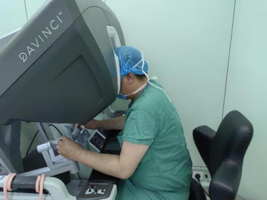 术中,徐红伟团队凭借着丰富的经验和精湛的技术,运用达芬奇机器人在“交错复杂的神经、血管迷宫”中小心穿梭游走,通过几个小切口便完成了胰十二指肠及其周围组织的精准根治性切除,并顺利进行消化道重建,整个手术过程出血量不到100ml。