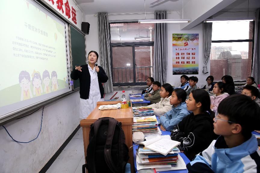 12月10日,焦作市五官医院、解放区疾控中心组织人员到解放区实验中学为学生们普及干眼症防治、艾滋病预防及口腔健康等健康知识。图为焦作市五官医院医务人员正在给学生普及干眼症预防知识。王正勋 侯林峰 王中贺/摄