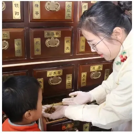 “未见药身,先闻药香”,走进中药房,排列整齐的药柜、琳琅满目的中药、四四方方的药匣,小朋友们可以亲自看一看、摸一摸。“这个是菊花”“这个是枸杞”“这个,还有这个我都认识”……他们好奇地观察着药材的形状和颜色,时不时提出自己的疑问,中药房工作人员耐心解答,让小朋友们切身领略到了大自然的慷慨馈赠,对中药材的特征及价值有了更加深刻的认识和理解。
