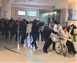 第二声“地震疏散报警声音”响起,强震结束,指令人员立即使用对讲机喊道“请所有人员向楼梯安全出口有序疏散”。医务人员和患者安全有序从楼梯疏散到安全地带,到达安全地带后,对人员撤离情况以楼层为单位进行清点、汇总。