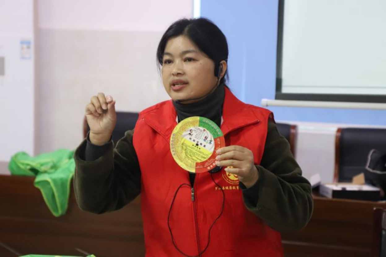 潘春凤就如何培养健康生活方式,借助健康支持性工具限油壶、限盐罐,腰围尺、膳食宝塔冰箱贴以及健康素养66条读本的具体使用,结合生活中的不良习惯,为大家诠释了健康的四大基石:合理膳食、适量运动、戒烟限酒、心理平衡,号召大家培养健康的生活方式,传播倡导“人人成为自身健康责任第一人”的理念。