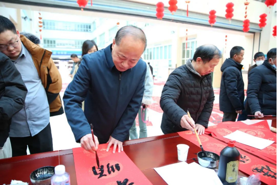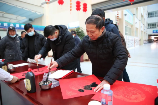 在门诊大厅,驻马店市书法家协会主席胡晖、副主席曹峰、李祉良带领市著名书法家徐清志、沈晓留、潘从峰、杨兴旺、曹奇、米红伟、陈南旭、汤银河等各展风采,挥毫泼墨,笔走龙蛇,一副副散发着清新墨香的喜庆春联和“福”字铺满地面,构成了一道独特的年俗文化风景。