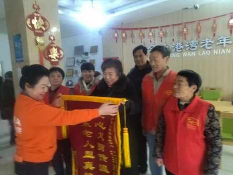 在金色港湾老年公寓,养老机构负责人给漯河夕阳红老年服务中心赠送了锦旗,感谢乔兰、刘文铭、李金林、刘素霞、盛志山、熊全忠、李书等14位义剪师傅们长期以来为该养老机构入住老人爱心义剪,并对这些退休老人长期照护“老老人”的高尚情怀和志愿奉献精神给予鼓励与肯定。