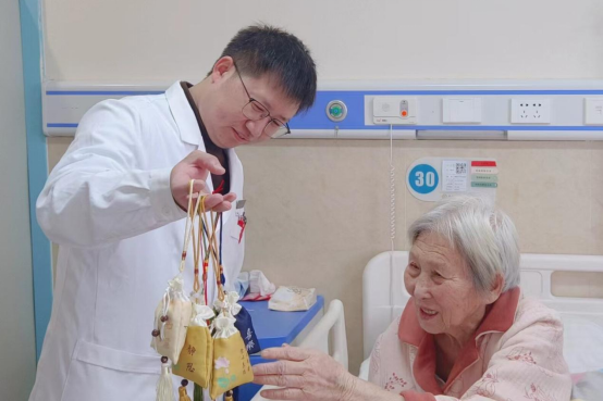 一大早,科室的医护人员们便在紧张有序的治疗工作间隙,精选薄荷、藿香、佩兰、丁香、冰片等中药材,依据中医理论科学配伍,开展了一场香囊制作活动。他们手法娴熟地将药材称重、碾碎,装入绣有牡丹、锦鲤等吉祥图案的香囊袋中。随后走入病房,为患者送上这份特别的节日礼物,并向患者详细介绍香囊提神醒脑的功效,同时鼓励他们积极配合治疗。“这味道真好闻,谢谢你们,过节还想着我们。”患者接过香囊,嗅到药香后露出笑容。