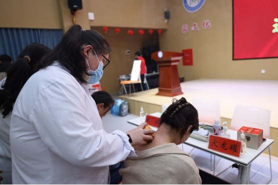 活动现场处处彰显医者仁心,老师们有序排队检查,专家团队以“一人一档”模式开展血压测量、心肺听诊、心电图、彩超、眼耳鼻喉等基础检查,针对教师职业特性定制健康建议,专业细致的问诊让三尺讲台的“健康画像”更清晰。当艾草清香弥漫会场,中医绝技轮番登场——推拿师巧手化解肩颈劳损,铜砭刮痧演绎经络奥秘,耳穴疗法展现“小豆贴大健康”的智慧,火龙罐更以温热熨帖之势驱散寒邪。