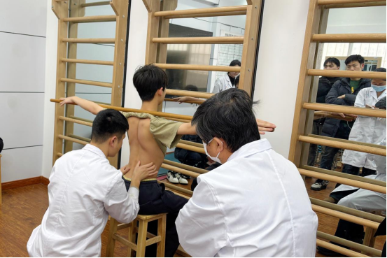 2月22日下午-23日上午的课程以“理论+实操+义诊”形式展开。王连成现场演示脊柱侧弯体态评估、三维矫正手法及个性化运动处方制定。漯河市中医院脊柱侧弯工作人员在专家的指导下进行实操练习,包括如何通过亚当斯前屈试验快速筛查脊柱侧弯以及运用王连成创立的“特发性脊柱侧凸整合疗法(SIT)”和脊柱康复专家系统帮助患者改善脊柱侧弯症状。现场互动热烈,学术思辨氛围浓厚。