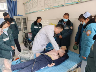 理论讲解结束后,授课医生利用模拟人进行了心肺复苏现场演示,让在场的医护人员对心肺复苏有了更直观的了解,并指导医护人员分别进行实操练习。培训现场,参训医护人员认真学习,积极互动。随后,现场分组进行急救演练。