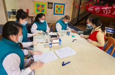 义诊现场,卫滨区妇幼保健站党员义工分为多个小组,有条不紊地开展各项义诊服务。在血糖测量、血色素测量与乙肝表面抗原检测区域,志愿者们耐心细致地为每一位老人进行检测,手法娴熟,动作轻柔。遇到一些行动不便的老人,他们还主动走到老人身边,蹲下身子为老人测量,确保每一位老人都能顺利完成检查。