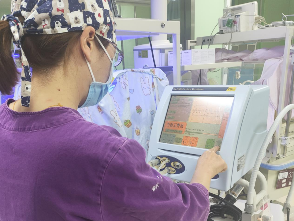 由于宝宝肺部发育不成熟,无法自主呼吸,医护人员精准调节各项参数,小心翼翼地为他连接上呼吸机,确保每一次呼吸支持都恰到好处,帮助他稚嫩的肺逐渐适应外界的空气。每一次接触患儿前后,护士们都要进行流动水洗手,严格执行无菌操作,用轻柔的动作、专业的操作,给予宝宝最贴心的照顾。