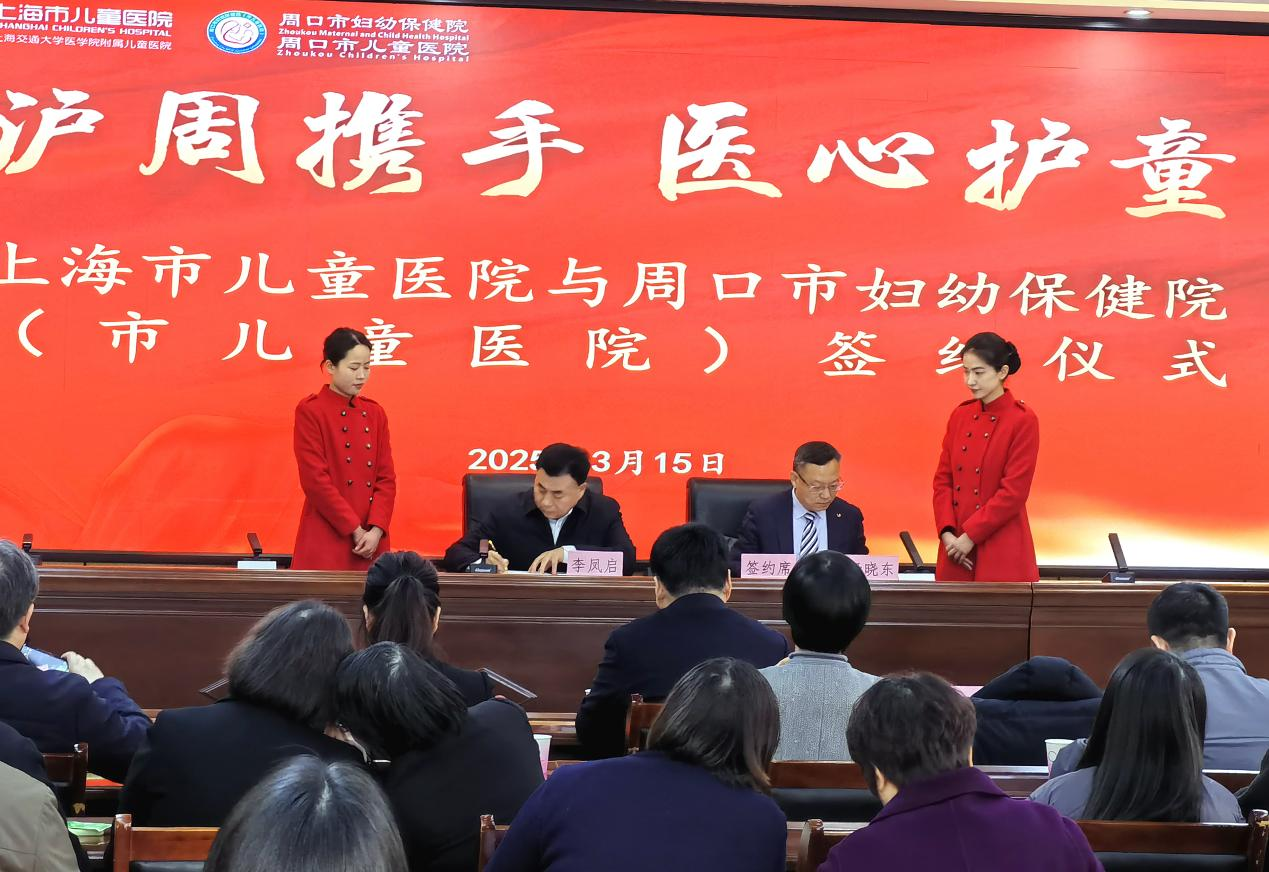 2025-3-15 来源:医药卫生网 - 医药卫生报 浏览:次医药卫生网讯(记者侯少飞 通讯员刘畅)3月15日,周口市妇幼保健院(周口市儿童医院)与上海市儿童医院技术合作签约、揭牌仪式正式举行。上海市儿童医院副院长杨晓东、何丽,周口市卫生健康委副主任麻文军,周口市妇幼保健院党总支书记、院长李凤启出席签约、揭牌仪式活动,并就此次深化沪豫卫生协作、提升区域儿童健康服务能力的重要活动给予深切厚望。