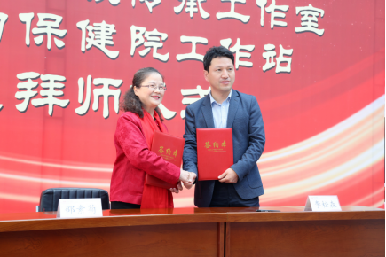 在热烈的掌声中,邵素菊与李松森签署合作协议,并与姚娜娜一同为河南邵氏针灸流派传承工作室洛阳市妇幼保健院工作站揭牌。