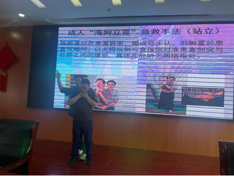 理论讲解结束后,进入实操环节。医护人员现场演示了心肺复苏和海姆立克急救法的操作步骤。在演示心肺复苏时,医护人员一边操作,一边强调按压位置、频率和深度的重要性,以及如何进行有效的人工呼吸。在演示海姆立克急救法时,医护人员邀请员工上台配合,通过模拟异物梗阻场景,展示了正确的施救手法。