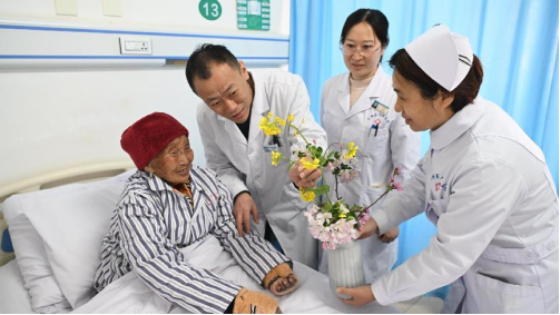 3月30日上午,长垣市人民医院眼科主任肖胜强、副主任司马利丹和护士长耿淑枝查房到百岁老人的床头,用插花验证手术效果。
