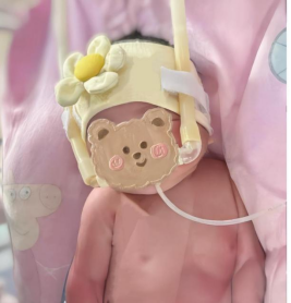“妈妈”们还真找到了解决办法,她们根据患儿出生体重以及头型大小,为上呼吸机的小患儿量身自制了呼吸机专用帽,通过借鉴护囟门帽子款式,头顶采用开放性设计,减少了头部包裹面积,增加了透气性;呼吸机帽子通过魔术贴固定代替了传统的胶带固定,能够稳固地固定呼吸机管路,避免管路因宝宝的移动而脱落或移位,也减少了因此引起的刺激和不适,提高了宝宝的舒适度,此外,通过合理的固定方式,还能够避免胶带对新生儿脸部造成的印记和损伤。