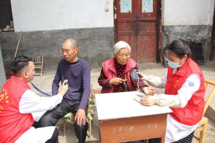 4月12日,襄城县丁营乡卫生院开展“春季义诊为人民”主题活动,组织志愿义诊医疗服务队深入村(社区)农户家里为行动不便老人义诊。图为丁营乡卫生院志愿者来到丁营社区刘丙乾夫妇家里,为老人测量血压、心肺听诊,深受老人欢迎。王正勋 古国凡/摄