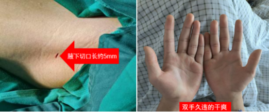 秦秀广在充分了解小明的病情和完善相关辅助检查后,带领团队为小明实施了无管单孔腔镜手术。术中,医师团队运用胸腔镜经双侧腋下5毫米切口(约米粒大小)进入胸腔内,精准定位并离断过度兴奋的交感神经链。手术全程仅用20分钟,术毕小明即刻麻醉苏醒,双手出汗立即停止,手掌由湿冷转为红润,恢复干爽。