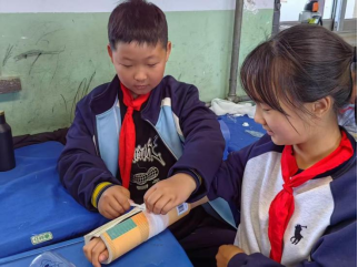 课堂上,李淑芳和护士刘晨阳精心设计了“情境化教学套餐”:通过情景模拟和操作演示气道异物梗阻的急救,带领学生们共同学习海姆立克急救法,学生们踊跃走上讲台,两两一组进行模拟实践。针对溺水、烫伤、擦伤、扭伤等常见意外伤害,两位老师结合丰富的理论知识和临床经验,用通俗易懂的语言、生动直观的方式向学生们进行了讲解和演示。针对运动中可能发生的骨折等突发状况,两位老师带着大家用课本模拟石膏和夹板,分组练习止血包扎、骨折固定等技能,引起了学生们的极大兴趣。