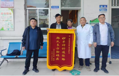 一个月前,潘女士因心慌、头晕急性发作来新店镇卫生院治疗,入院时,接诊医生韩书刚边咨询潘女士情况边测量血压,了解到潘女士有脑梗后遗且有高血压,血压测量结果170/90mmHg,韩医生给予针灸治疗,潘女士症状减轻。韩医生根据潘女士的病情,与丈夫薛先生沟通后,给予针灸治疗并辅以中药调理。在患者及家属的积极配合下,在韩医生的精心治疗护理下,1个疗程后,潘女士病情稳定,血压降到145/80mmHg,身体逐渐康复,特意来送锦旗表达感谢。