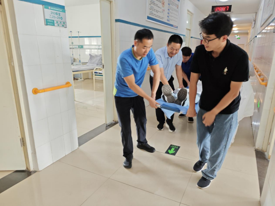 演练现场,随着警报声响起,各科室人员迅速响应,按照既定方案,采取半蹲下、护住头部的避震姿势,有序撤离至安全区域。此外,医护人员们进行了模拟演练,对行动不便的住院患者,用担架迅速转移至安全地带。