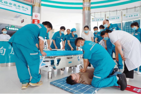 此次演练模拟两个真实且常见的场景。场景一中,一位老年患者在病房内行走时不慎跌倒。值班护士发现后,迅速启动应急预案,第一时间通知医生,并携带抢救物品飞奔至患者身旁。医生快速到达,与护士紧密配合,对患者进行初步评估,测量生命体征,判断伤情。从发现患者跌倒,到启动应急预案、采取应急措施、报告流程,再到最终妥善处置,整个过程紧张有序,医护人员反应迅速、分工明确、配合默契、操作规范,充分展现了临床一线人员良好的应急能力和团队协作精神。场景二模拟了一名男士在门诊大厅突发昏迷的情况。门急诊医生在听到家属呼救后,立即通知急诊医护。医师快速判断病情后,立即对“患者”进行心肺复苏。与此同时,急诊医护人员携急救物品迅速推抢救车来到现场。医护人员齐心协力、紧密配合,经过一番紧张的抢救,“患者”恢复心律,随后被迅速转运至急诊抢救室进一步诊疗。整个演练过程仅用时7分钟,充分体现了“时间就是生命”的价值,展示了门急诊团队协作和快速识别能力以及门急诊之间无缝衔接的急救体系。