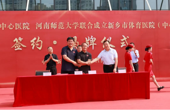 在热烈的掌声中,三家协作单位代表签订了协约,随后,李激扬、刘兵共同为医院揭牌,新乡市体育医院(中心医院院区)正式成立。