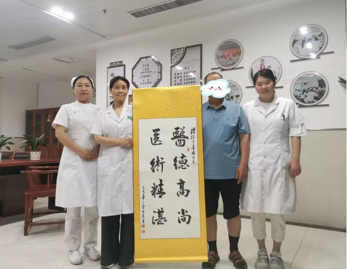 经过系统治疗,王女士的症状明显改善,重新找回生活品质。令人感动的是,其家属因股骨头坏死导致左髋部疼痛前来就诊,同样在该科获得显著疗效。为表感激,他们特意创作“医德高尚 医术精湛”作品相赠,以翰墨传递医患真情。