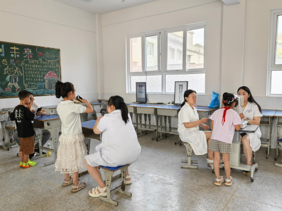 活动现场,医护人员为学生们细致检查了视力、屈光状态、脊柱侧弯、高低肩、龋齿以及耳部、扁桃体健康状况,及早发现潜在健康隐患。针对暑期这一学生健康管理的关键期,各科专家结合检查结果,提供了精准、实用的健康指导:眼科医生重点强调了暑期用眼卫生,呼吁严格控制电子产品使用时间,保证每日不少于2小时的户外活动,让眼睛得到充分休息;儿童康复科医生针对体态问题,提供了详细的居家矫正训练方案,指导家长做好监督;口腔科医生在检查中发现部分学生存在龋齿风险,现场教授了规范的“巴氏刷牙法”,并提醒学生假期保持规律作息、减少甜食摄入,维护口腔健康;耳鼻咽喉科医生特别提醒学生暑期游泳时注意耳部防水,预防因不当游泳引发中耳炎等耳部疾病。