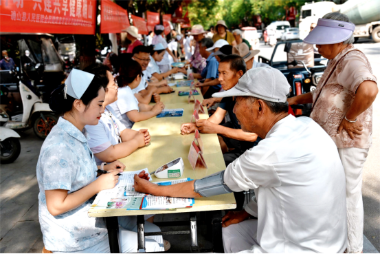 活动现场,心血管内科一病区、内分泌科、康复医学科、疼痛科、神经内科一病区、呼吸与危重症医学科医护人员在义诊桌前一字排开,为过往群众提供测血压、测血糖、义诊咨询服务,闻讯前来的群众络绎不绝。专家们针对群众所咨询的头晕、关节疼痛等常见症状,通过问诊、检查等方式,详细了解群众的身体状况,并为他们提供针对性的用药指导、治疗方案和健康指导。“最近总头晕,没想到在家门口就能让专家看诊,太方便了!”市民张大爷感慨道。一旁的血压、血糖测量区排起长队,护士边操作边讲解:“夏季出汗多,您这血糖值要注意补水和饮食调节。”