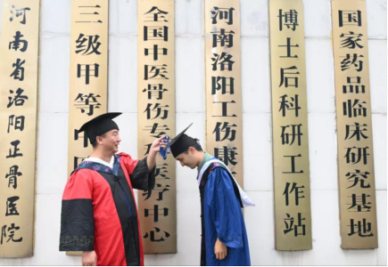 当日上午,在河南省洛阳正骨医院(河南省骨科医院)东花坛院区门诊楼前,当流苏从右鬓划至左肩时,身为脊柱微创一科科主任、主任医师的赵刚指尖轻触过付豪学位帽的瞬间,三年前初见时的场景在两人眼中同时闪过——带着几分稚气的付豪捧着《平乐正骨》古籍求教,导师书案上摊开的批注稿还带着墨香。此刻房顶的光洒落,将导师掌心的老茧映得清晰,那是常年握手术刀与批阅文献留下的痕迹。
