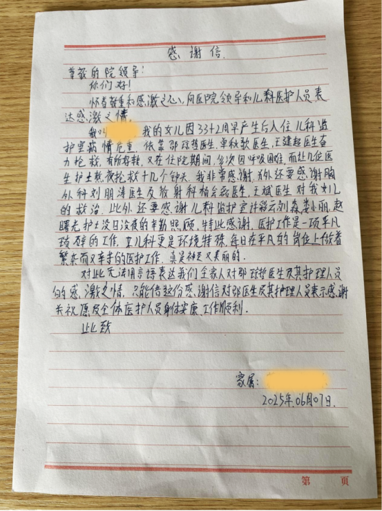 为表达对医护人员的感激之情,孩子父母专门将一封感谢信送到医院,称赞医务人员“真是神圣又美丽”。