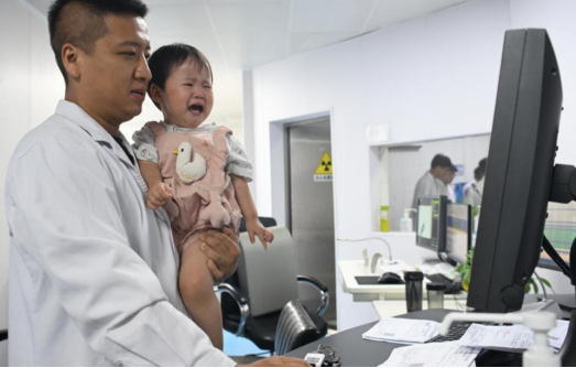 6月27日上午,河南省洛阳正骨医院(河南省骨科医院)东花坛院区影像中心第二DR室,一位患者带着年幼的女儿做检查。