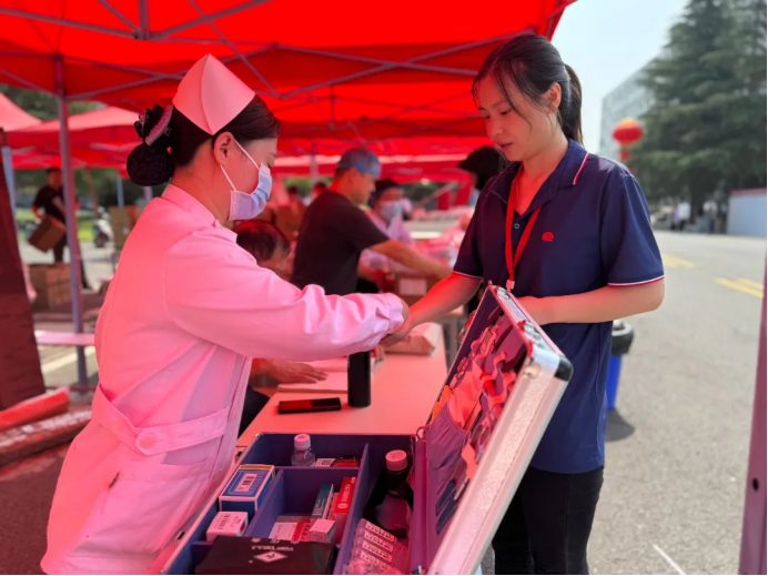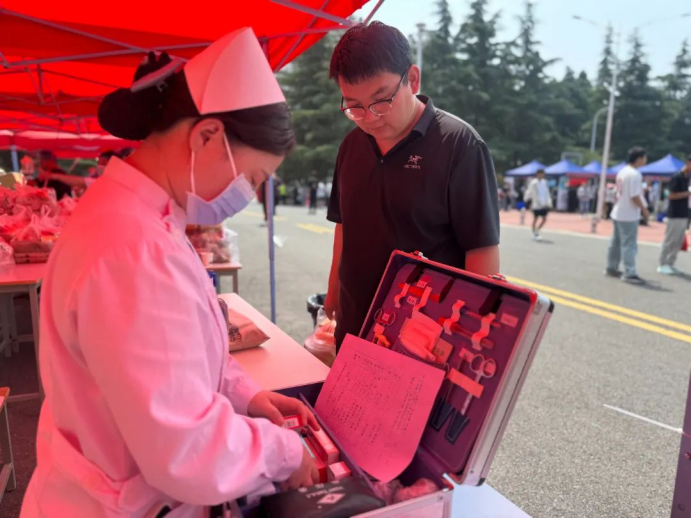 一排红色帐篷在晨曦中悄然立起。与周围高校招生展位不同,这里的医护人员正有序摆放血压计、血糖仪、听诊器、急救箱等一应俱全。针对近日持续的高温晴热天气,医疗队特别强化了防暑应急预案——藿香正气水、口服补液盐等防暑药品被置于醒目位置,速效救心丸、布洛芬缓释胶囊等急救物资也已准备就绪。