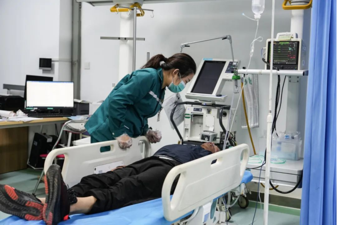 演练模拟场景:在医院食堂就餐的患者、家属及医护人员中,多人出现在餐厅就餐后陆续腹痛、腹泻、呕吐等疑似食物中毒症状。模拟救治过程中,急诊医学科医护人员与前来支援的各科室人员紧密配合,有条不紊地对患者开展生命体征监测、病情评估和临床诊断、紧急救治等工作。多部门科室齐心协力,共同救治,确保患者在短时间内得到妥善处理。