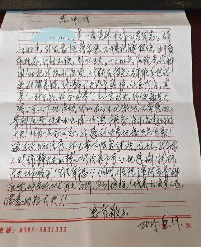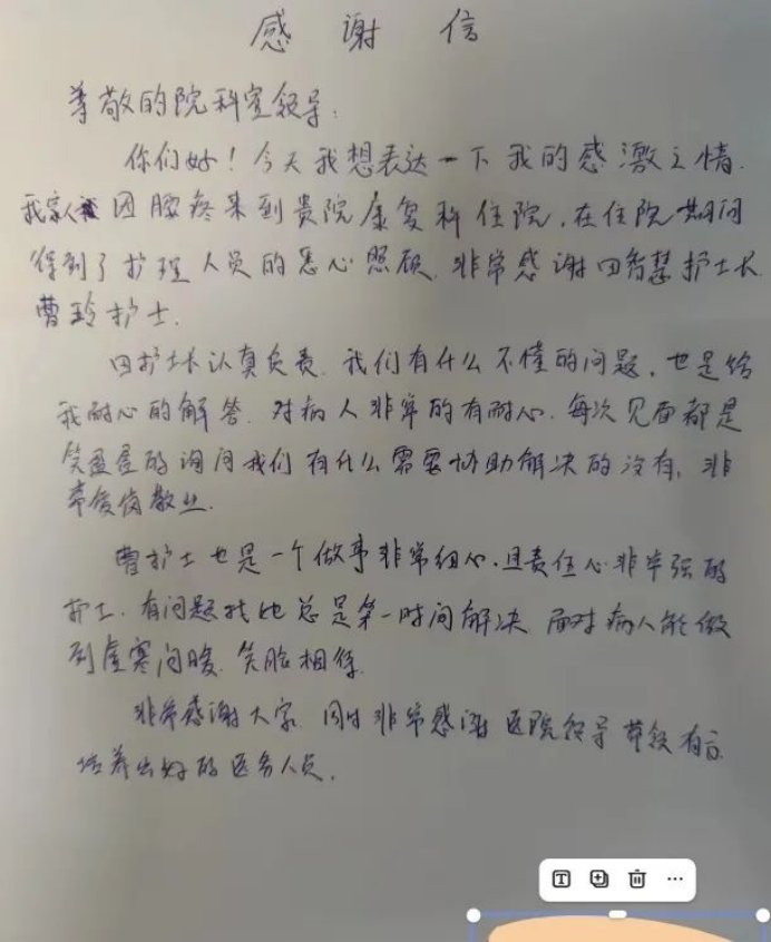 另一封感谢信来自因腰疼住院的患者,信中感谢了护士长田智慧和护士曹玲。治疗期间,两位护理人员将专业、细致的服务贯穿始终。从日常康复护理操作到患者心理疏导,她们始终保持高度的责任心,耐心解答疑问、贴心安抚情绪,用暖心服务助力患者身心康复,赢得患者由衷的信赖与感激。