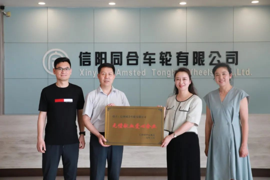信阳市中心血站授予信阳同合车轮有限公司“无偿献血爱心企业”荣誉牌匾