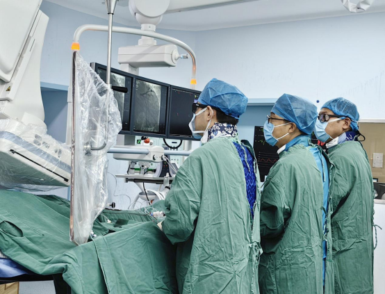 该院胸痛中心医师李政伟凭借丰富的经验,迅速识别出患者极有可能是凶险的“急性心肌梗死”,立即启动胸痛患者处置预案。3分钟内完成首份床旁心电图检查,结合患者病史体征诊断为“急性前壁心肌梗死(ST 段抬高)”。患者曾于2014年和2020年先后两次因胸痛行冠脉支架植入术,此次病情十分危急,必须立即行急诊PCI(经皮冠状动脉介入治疗)开通闭塞血管。