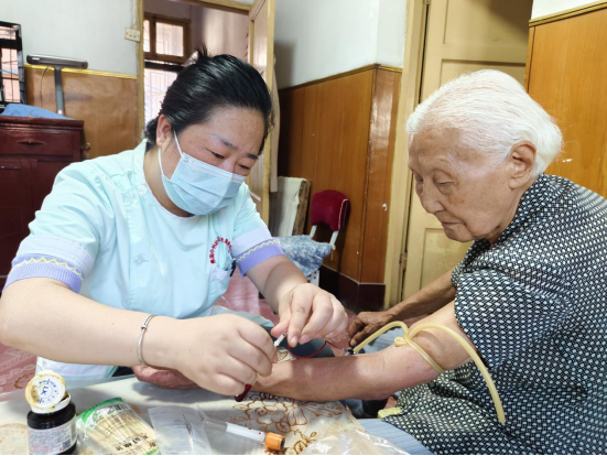 7月14日,焦作市解放区中州社区卫生服务中心医务人员入户为群众体检。6月份以来,焦作市解放区中州社区卫生服务中心组织8支家庭医生团队顶烈日、冒酷暑走进20个小区,入户为1000余名行动不便居民、慢性病患者等进行健康检查、用药指导及签约履约服务。王正勋 侯林峰 张丽/摄