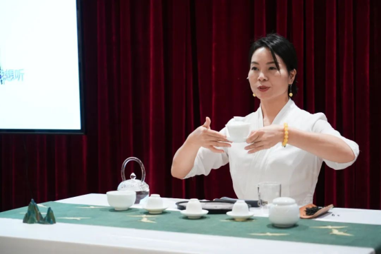 在实践环节,学员们分组实操练习,在张美华指导下学习盖碗冲泡、闻香品茗、奉茶礼仪等技巧。活动现场茶香氤氲,笑语盈盈,大家沉浸于“以茶修身”的意境中,感受传统茶艺的独特韵味。