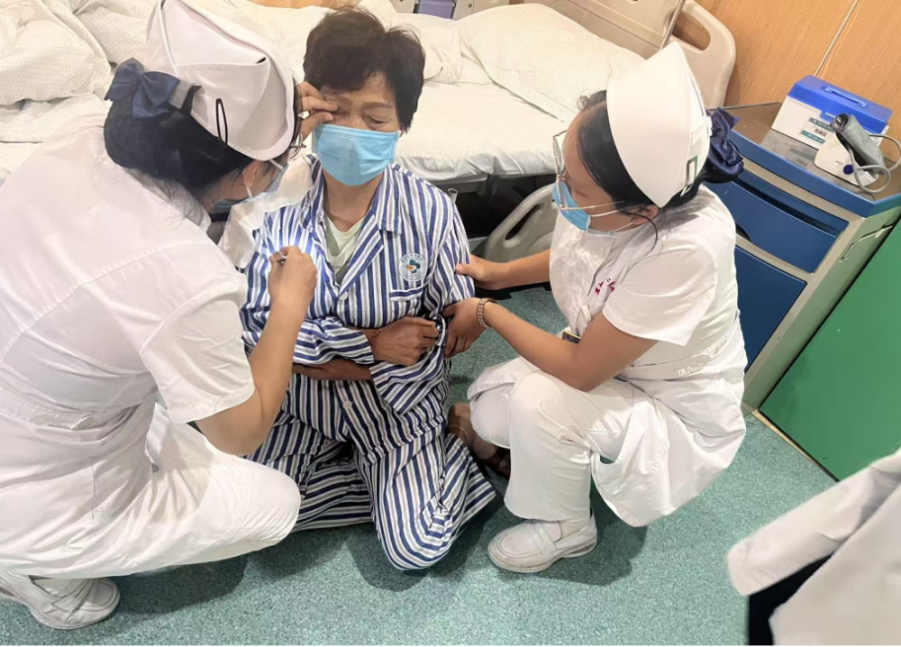 培训结束后,实战演练随即展开。演练模拟情景为患者做完锁骨骨折术后第二天,患者有便意却未告知家属及护士,自行前往卫生间。下床时突然脚一滑跌倒在地,蹲坐在地面。发现患者跌倒后,值班护士第一时间赶到现场,立即轻拍呼唤患者、评估意识状态,同时快速测量生命体征并呼叫医生。冯东亮接到通知后迅速到场,仔细检查患者有无骨折、出血等伤情,结合患者病史初步判断病情并下达处置医嘱。医护人员默契配合,平稳将患者转移至病床,并及时与家属沟通情况。整个过程紧张有序,严格遵循应急预案规范操作。