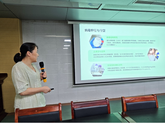 培训会上,感控科主任胡爱花以“基孔肯雅热的临床特征与鉴别诊断”为主题,结合最新诊疗指南展开系统讲解。胡爱花从疾病的病原学特点入手,详细介绍了基孔肯雅热由伊蚊传播的特性,强调其“起病急、发热高、关节痛显著”的典型症状——患者常出现突发性高热(体温可达39℃以上)、全身肌肉及关节剧痛(尤以手足小关节为重),部分患者伴有关节肿胀、皮疹等表现。
