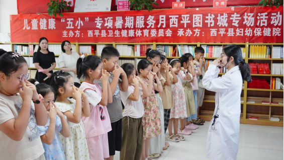 其中,西平县卫生健康体育委员会组织县妇幼保健院专家团队于8月13日走进新华书店西平书城,开展儿童健康“五小”专项暑期服务月活动。活动中,妇幼保健院儿童保健部相关专家对现场几十位小朋友开展了口腔保健、呵护眼睛、预防近视、脊柱侧弯、常见异常步态等健康科普讲座。活动现场还举行了正确刷牙操作、眼保健操、视觉专注力题卡比赛、听觉记忆题卡等互动体验小游戏。医护人员手把手教家长和孩子进行单人徒手心肺复苏术、海姆立克法等动作,普及急救常识,让孩子们直观地了解和掌握急救方法。此次活动,让健康服务走出了传统医疗场景,融入孩子们熟悉的文化空间,既满足了亲子家庭的阅读需求,又传递了实用的健康知识,为孩子们的健康成长开启了美好的篇章。