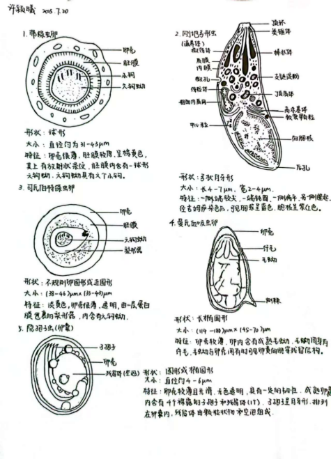 15名实习生参与其中,每人参照教材和镜下实拍图像,绘制4至5种寄生虫或虫卵,不仅精准呈现形态,还标注关键结构、描述形态特点。这个过程,是带教中“理论联系实际”的生动落实,让抽象的知识点通过画笔转化为具象的认知。