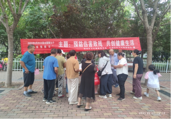 九州社区卫生服务中心在九州湘江游园开展“预防伤害致残,共创健康生活”主题宣传。现场通过悬挂横幅、张贴海报、发放宣传资料等形式,向过往群众普及残疾预防相关知识,引导大家树立“自己是健康第一责任人”的理念。针对群众提出的疑问,工作人员耐心解答,让大家对残疾预防有更深的认识。