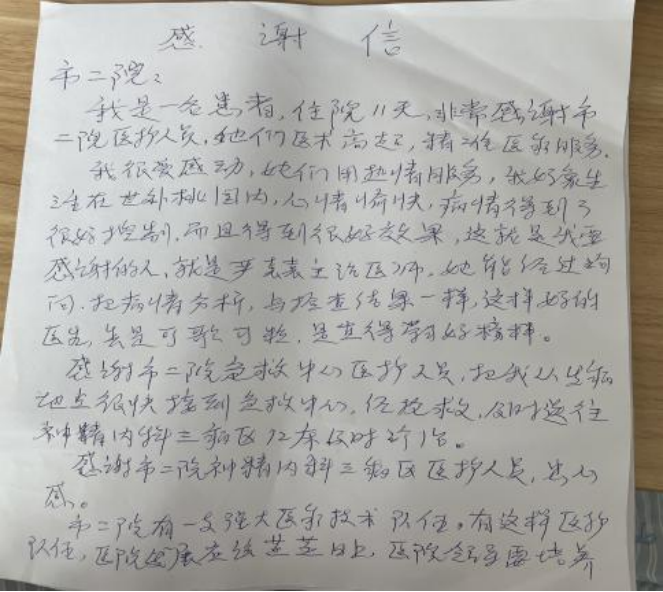 同时,12床患者刘阿姨,在住院期间,深切感受到医护人员高超的医术、精准的医疗服务,尤其是主管医生严媛媛,能够仔细查体,耐心询问及告知病情,精准治疗,病情得到了很好的控制,出院时,她以一封感谢信表达了感谢之情。