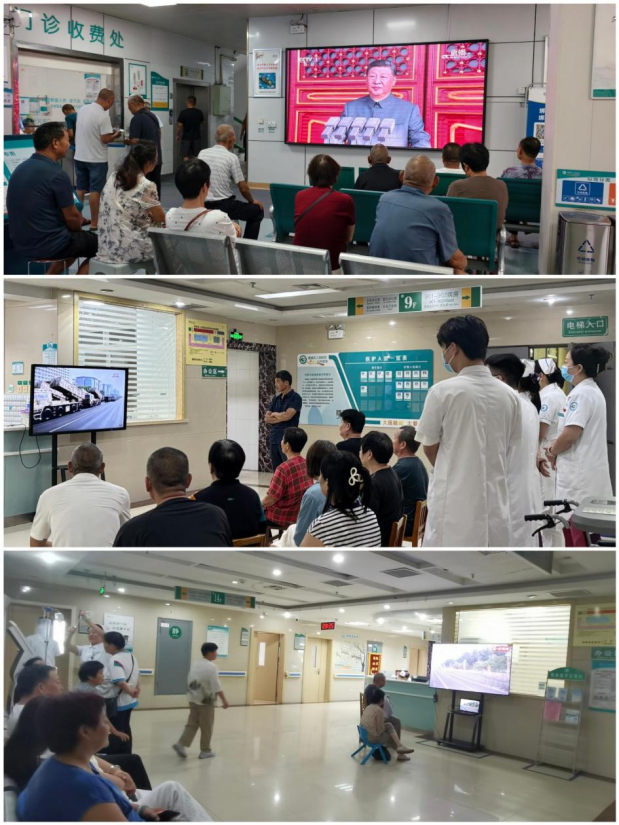 在医院会议室,郾城区卫生健康委党组成员、副主任徐燕与区人民医院班子成员、部分职能科室人员齐聚一堂;在门诊大厅、住院部大厅、各病区,患者和家属们在医护人员的协助下,也纷纷坐到屏幕前……大家目光共同聚焦阅兵盛况,脸上都洋溢着灿烂的笑容,激动的心情难以言表。