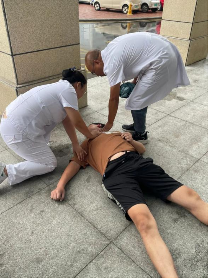 “是癫痫!大家散开点,保持通风!”王利娟冷静地判断病情,迅速稳住了现场有些慌乱的局面。与此同时,住院部服务中心的护士们立即行动起来,将平时的训练成果充分运用到实际中。王利娟迅速跪在患者身边,小心地将他的头偏向一侧,防止分泌物误吸入气管导致窒息,又轻轻解开他的衣领和腰带,以保持呼吸通畅。医生赵利方和护士万晴也已飞快地跑过来,给患者测量生命体征,严密监测着患者的脉搏、呼吸和抽搐情况,随时准备进行下一步抢救。收费处的段晓旭和梁竞驰护士则赶紧联系急诊科,并维持现场秩序,安抚其他受惊的群众。