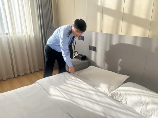 此次专项检查,监督执法人员重点围绕三个内容展开。一是证件公示规范性,现场核查各场所《卫生许可证》是否在显著位置悬挂、是否处于有效期内,从业人员健康合格证明是否齐全且在有效期内,确保经营资质透明、合法。二是消毒布草卫生状况,深入客房及布草存放间,检查床单、被罩、枕套等公共用品是否做到“一客一换”,布草清洗消毒是否存在污渍、破损或异味等问题。三是场所内清洁情况,对客房内桌面、床头柜、卫生间洁具等高频接触部位的清洁情况进行细致检查,要求经营者严格落实日常清洁制度,确保房间无卫生死角、环境整洁舒适。